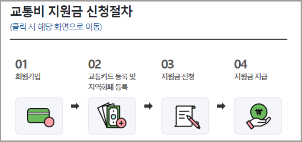 포털 회원가입 - 교통카드 및 지역화폐 등록 - 지원금 신청 - 지원금 지급