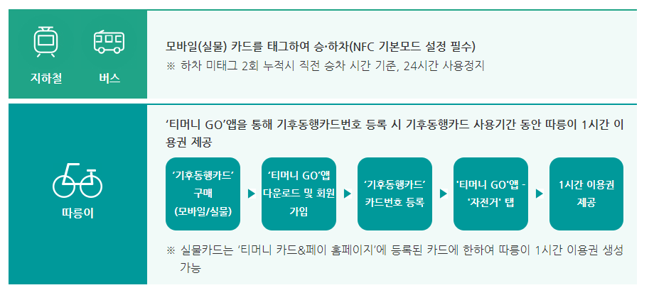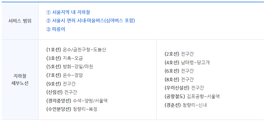 • 이용범위: 서울지역 지하철, 서울시 면허 시내·마을버스, 따릉이
