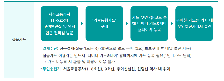 ※ 실물카드 판매처: 서울교통공사 1~8호선 고객안전실(1호선은 서울역 ~ 청량리역)/ 9호선·우이신설선·신림선 역사 주변 편의점