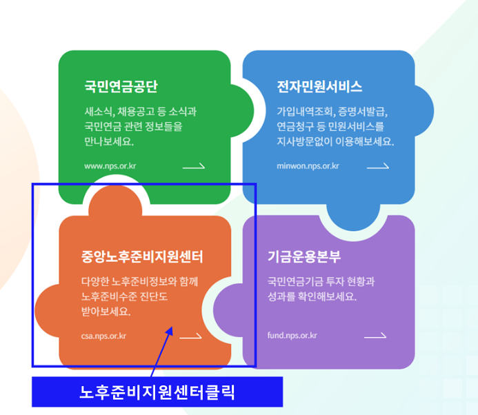 ① 국민연금 홈펭지에서 '중앙노후준비센터' 를 눌러주세요