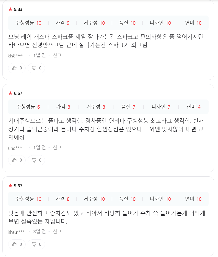안정성 면에서는 오히려 모닝이나 레이보다 문짝이 두꺼워 더 단단하고 안전하다는 평가가 있습니다. 실제 오너 만족도 조사에서 스파크는 5점 만점에 4.4점을 받아 국내 경차 중 가장 높은 만족도를 기록했습니다.