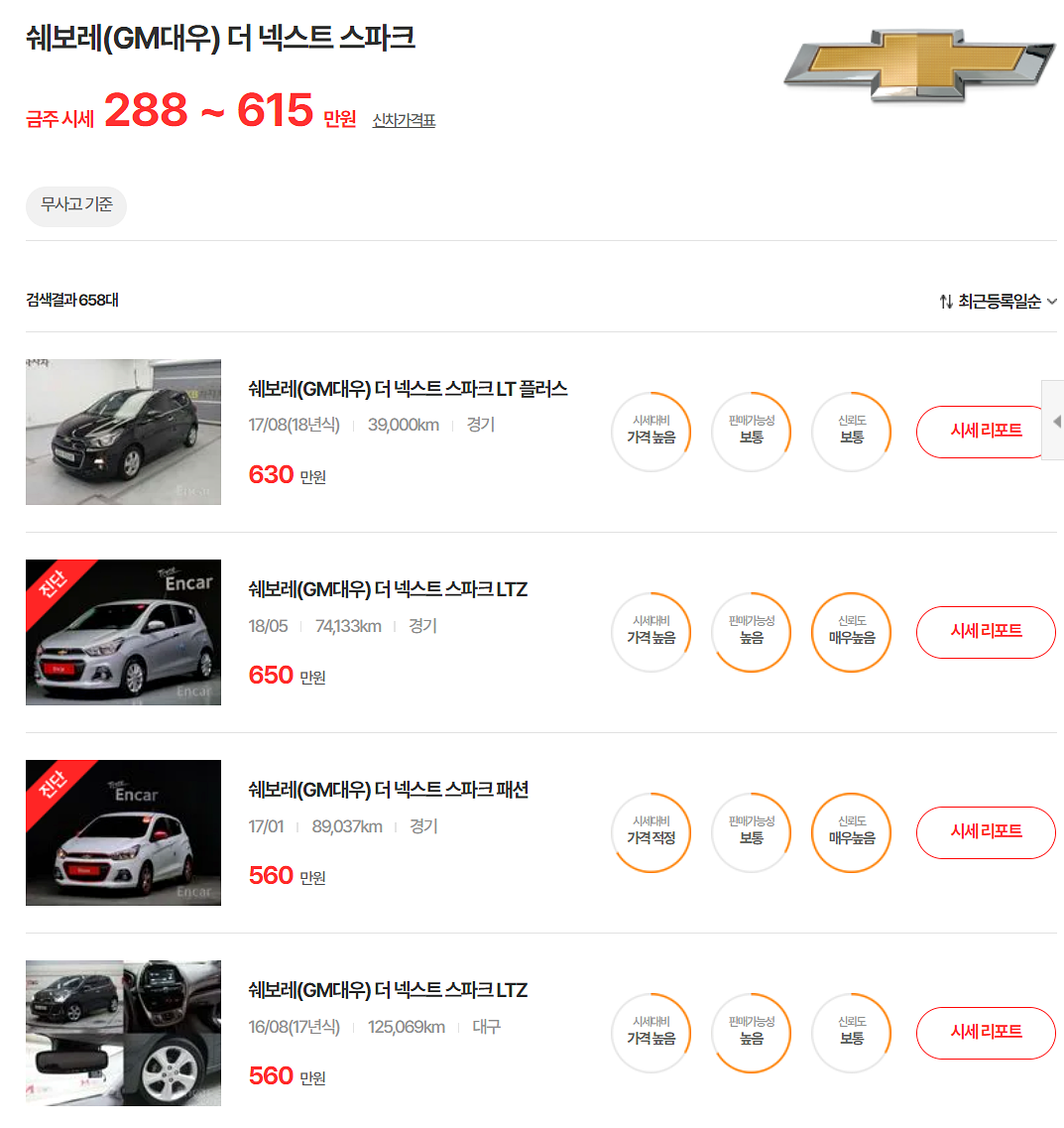 15~18년식 더 넥스트 스파크 중고차 시세는 288~615만 원입니다. 주행거리가 4~5만 km인 차량은 약 500~600만 원 사이에 거래되고 있습니다. 이 연식에서 중고차를 많이 찾는 편입니다. 구매 시에는 미션 상태와 냉각수 보조 탱크를 꼼꼼히 확인하시기 바랍니다.