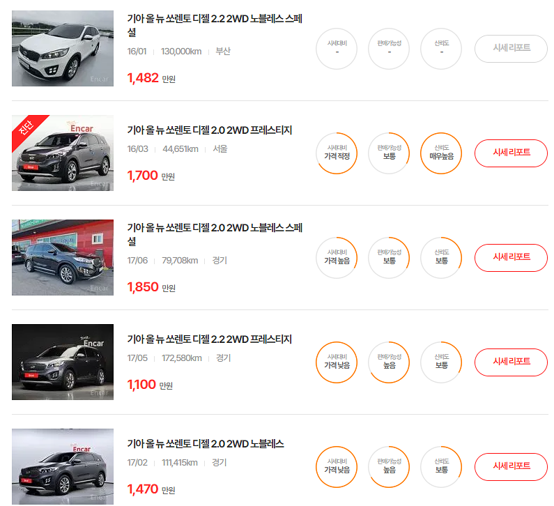 14-17년식 올 뉴 쏘렌토 중고차 시세