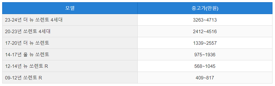쏘렌토 중고차를 찾으신다면, 2015~2018년식의 더 뉴 쏘렌토나 올 뉴 쏘렌토 모델을 추천드립니다. 이 연식 모델들은 적절한 가격과 안정적인 성능을 제공하므로 좋은 선택이 될 수 있습니다. 이상의 쏘렌토 중고차 시세 정보를 참고하시기 바랍니다.