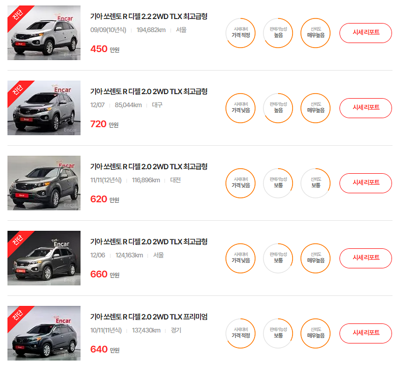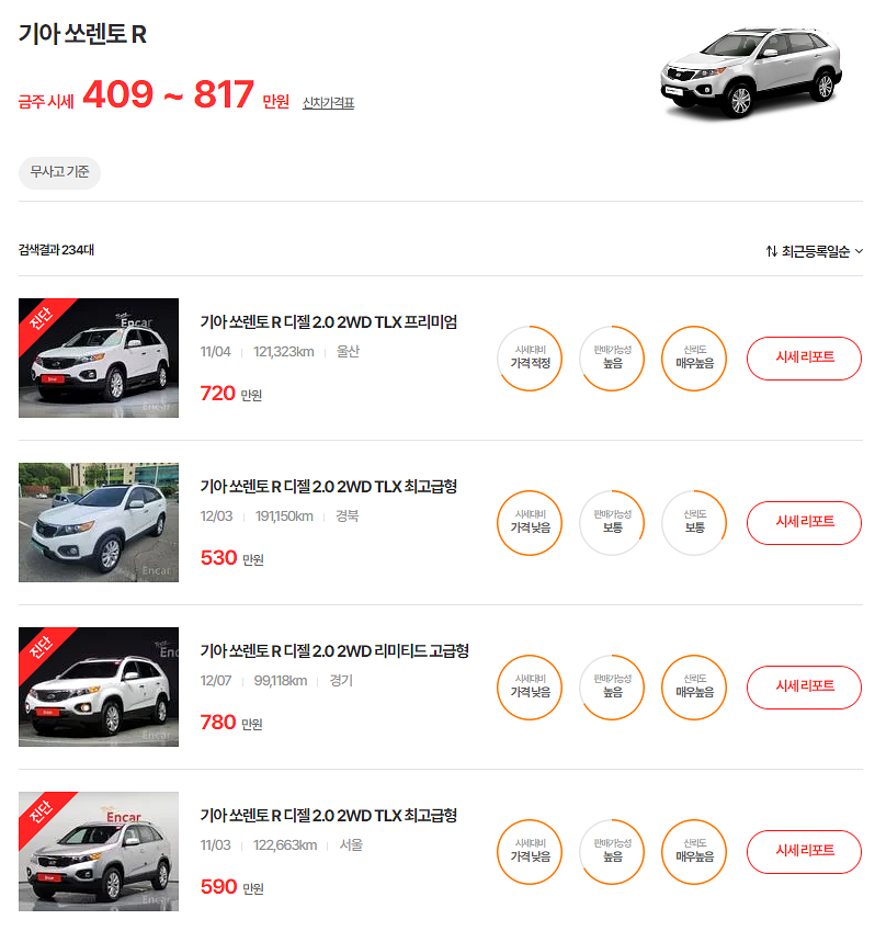 2009~2012년식 쏘렌토 R의 중고차 시세는 409만 원에서 817만 원 사이입니다. 이 연식 모델은 1천만 원 이하의 가격으로 구매할 수 있지만, 환경부담금이 추가로 발생할 수 있음을 염두에 두셔야 합니다.