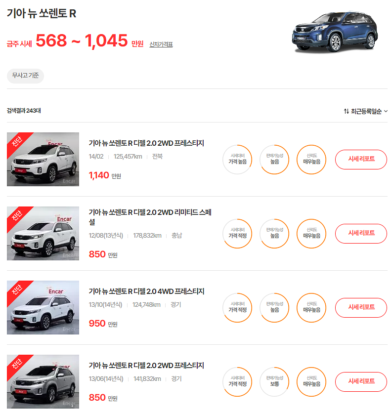 12-14년식 뉴 쏘렌토 R 중고차 시세