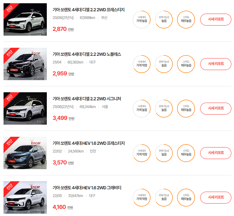 2020~2023년식 4세대 쏘렌토의 중고차 시세는 2,412만 원에서 4,516만 원까지 다양합니다. 하이브리드 모델은 가솔린이나 디젤 모델보다 감가가 덜 되며, 특히 2023년부터 하이브리드 중고차의 수요가 증가하고 있습니다.