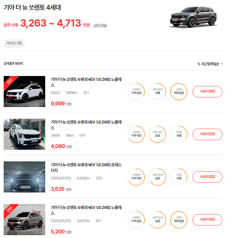 2023~2024년식 더 뉴 쏘렌토의 중고차 시세는 3,263만 원에서 4,713만 원 사이입니다. 엔카에 등록된 매물은 총 183대로, 신차와 거의 다름없는 중고차가 많습니다. 현재 쏘렌토의 출고 대기 기간은 가솔린 및 디젤 모델이 약 1.5개월, 하이브리드 모델은 7개월 정도입니다. 이로 인해 신차와 중고차 간 가격 차이가 크지 않을 수 있습니다.