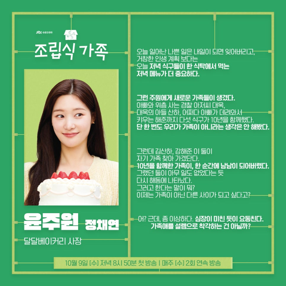 윤주원 역을 맡은 정채연은 청순한 매력과 강단 있는 연기력을 겸비한 배우로, 이번 작품에서도 섬세한 감정 연기를 통해 캐릭터에 생동감을 더할 것으로 기대됩니다.