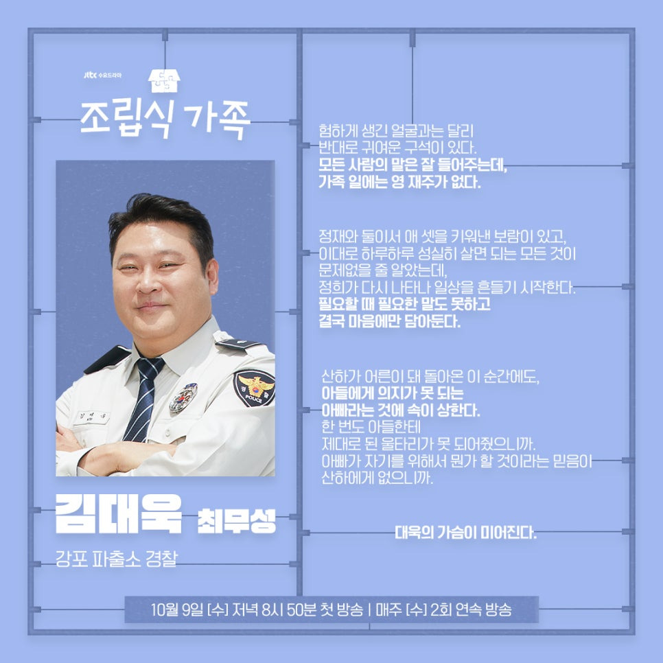 김대욱은 산하의 아버지이자 경찰로, 강인한 외면과는 달리 섬세한 내면을 지닌 인물입니다. 그는 아들 산하가 자신을 믿고 의지하기를 바라는 마음을 품고 있지만, 현실에서는 여전히 가족 간의 갈등과 해결해야 할 문제들이 남아 있습니다. 이러한 복잡한 관계는 극의 긴장감과 감정적인 깊이를 더합니다.