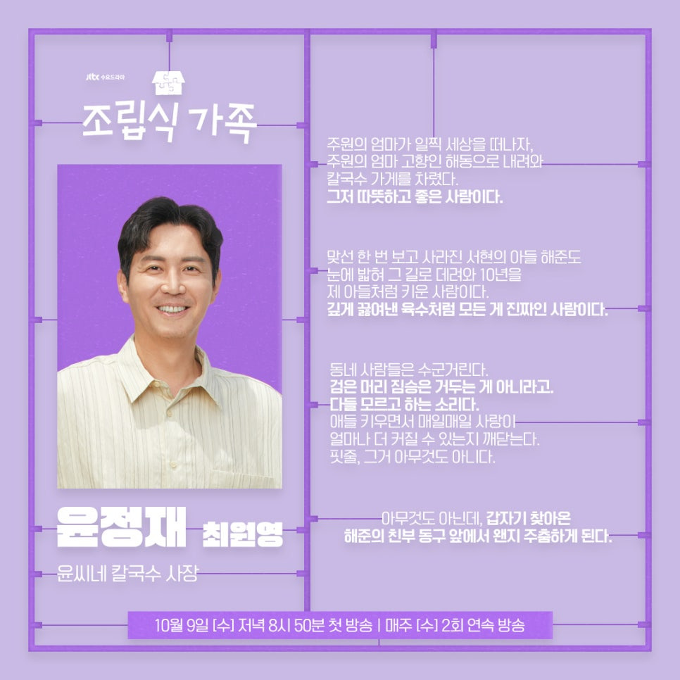 2024년 10월 9일 첫 방송된 조립식 가족은 청춘의 성장과 가족애를 주제로 시청자들에게 감동을 선사하고 있습니다. 총 16부작으로 제작된 이 드라마는 매주 수요일 저녁 8시 50분에 JTBC에서 방영되며, OTT 플랫폼 티빙과 넷플릭스에서도 시청할 수 있습니다. 김승호 감독이 연출을 맡았고, 홍시영 작가가 극본을 담당했으며, 황인엽, 정채연, 배현성 등이 주요 캐릭터로 출연해 열연을 펼치고 있습니다.