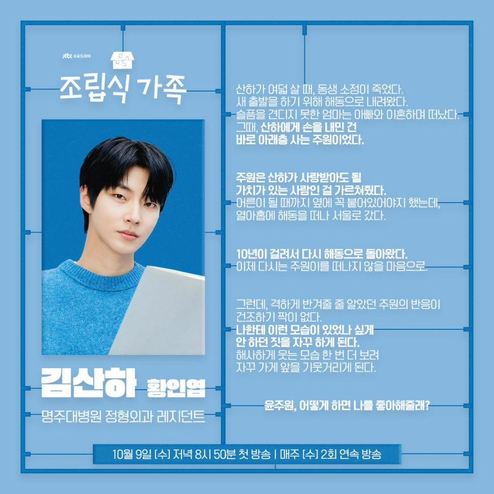 김산하는 명주대병원 정형외과 레지던트로, 어린 시절부터 조숙한 성격과 깊은 내면을 가진 인물입니다. 동생의 죽음 이후 가족이 해체되며 큰 상실감을 겪고, 부모의 이혼과 어머니의 사고로 인한 반신불수 상태는 그를 더욱 외롭게 만듭니다. 상처로 인해 마음의 문을 닫았던 산하는 새로운 가족인 주원을 만나며 그의 이야기가 펼쳐집니다.