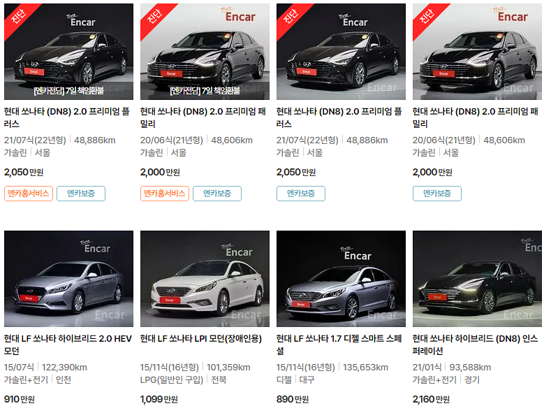 중고차 매물이 가장 많은 엔카에서 다양한 모델의 가격을 쉽게 파악할 수 있습니다.