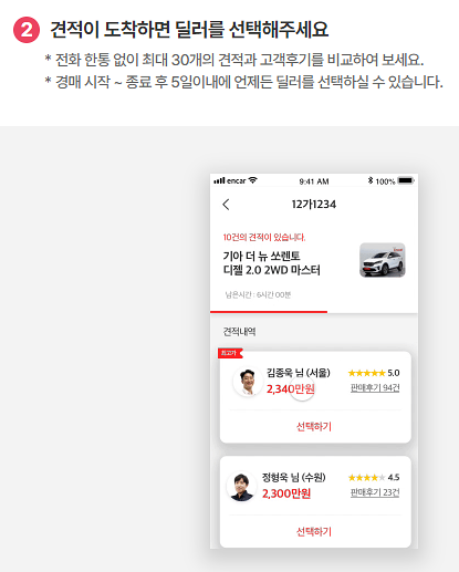 엔카에서는 비교견적 시스템을 통해 딜러에게 차량을 판매할 수 있습니다. 이 시스템은 입찰 경쟁 방식으로 최대 30개의 견적을 받을 수 있으며, 판매자가 원하는 딜러를 선택하여 거래를 진행합니다. 이때 주의할 점은 판매하려는 중고차의 적정 가격대를 미리 파악하는 것입니다. 실시간으로 올라오는 매물들의 금액대를 참고하여 부당하게 낮은 가격에 팔지 않도록 주의해야 합니다.