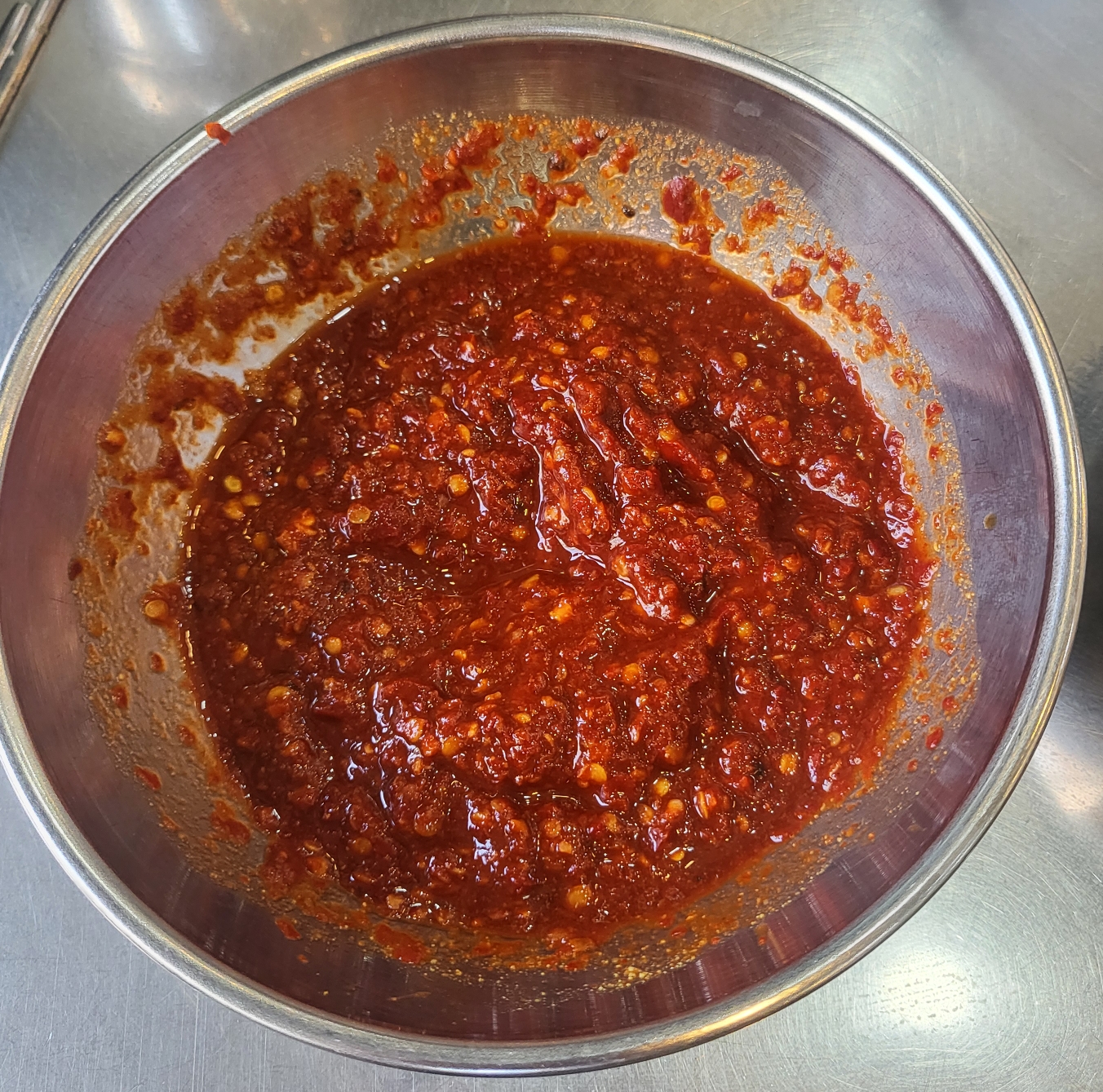닭이 끓기를 기다리는 동안 양념장을 만드시면 되는데요, 다진 양념(다데기)에 간장, 식초, 겨자를 취향껏 조금씩 섞어서 만드시면 됩니다
