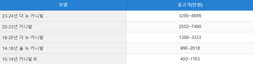 10~14년식 카니발 R 중고차의 시세는 400만 원에서 1163만 원 사이입니다. 만약 예산 1000만 원 이하로 밴을 구하려면 카니발 R이 유일한 선택일 수 있습니다. 차량이 오래된 만큼, 정비 이력과 사고 이력, 주요 부품의 교체 이력을 꼼꼼히 확인하는 것이 중요합니다!