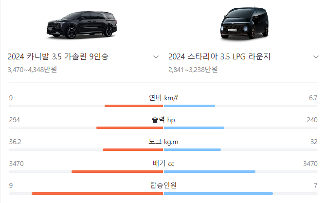 카니발 가솔린과 스타리아 LPG 모델을 비교해 보면, 두 차량 모두 연비가 좋지 않지만 스타리아 LPG는 특히 낮습니다. LPG 모델은 대부분 영업용으로 사용되기 때문에 가솔린 모델에 비해 연비가 매우 떨어집니다. 가격 측면에서는 카니발이 스타리아보다 상당히 비쌉니다.