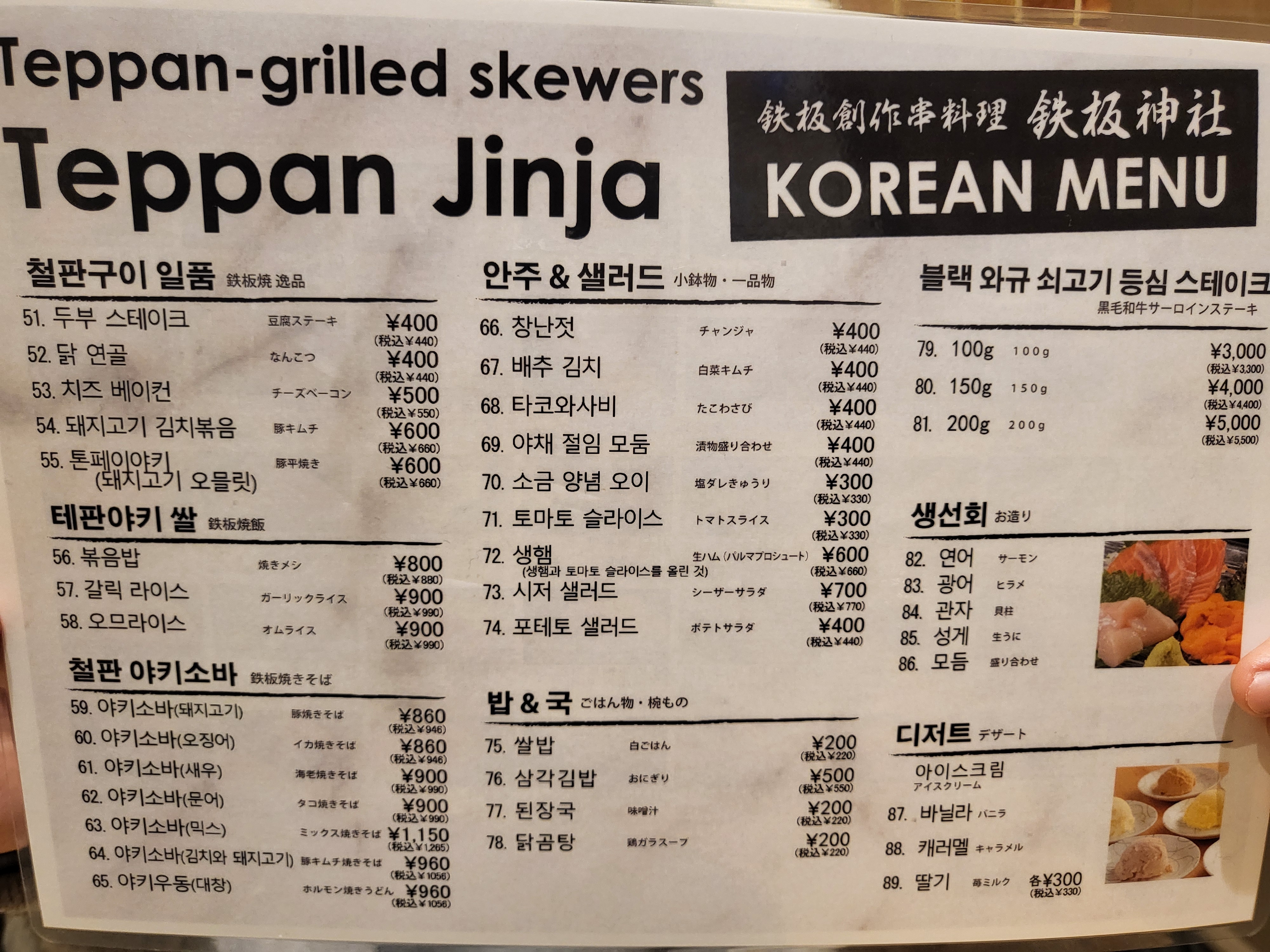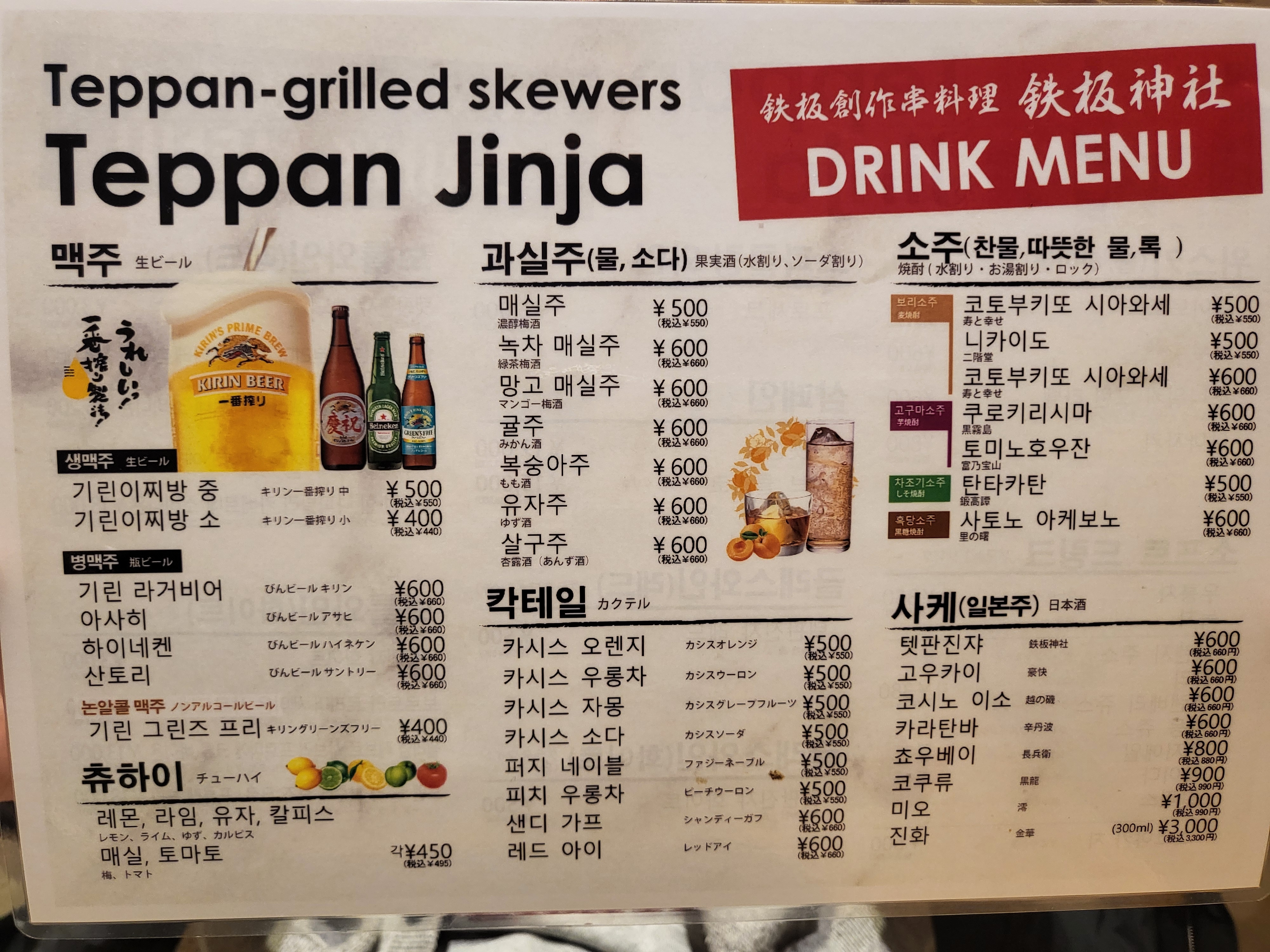 테판진자에는 한국어 메뉴판이 있는데요 꼬치마다 사진이 있고 옆에 숫자도 적혀있어서 어렵지 않게 주문 하실수 있어요. 가격도 우리나라 돈으로 3천원이 넘는게 없습니다 저렴한 가격으로 즐길수 있어서 참 좋았습니다