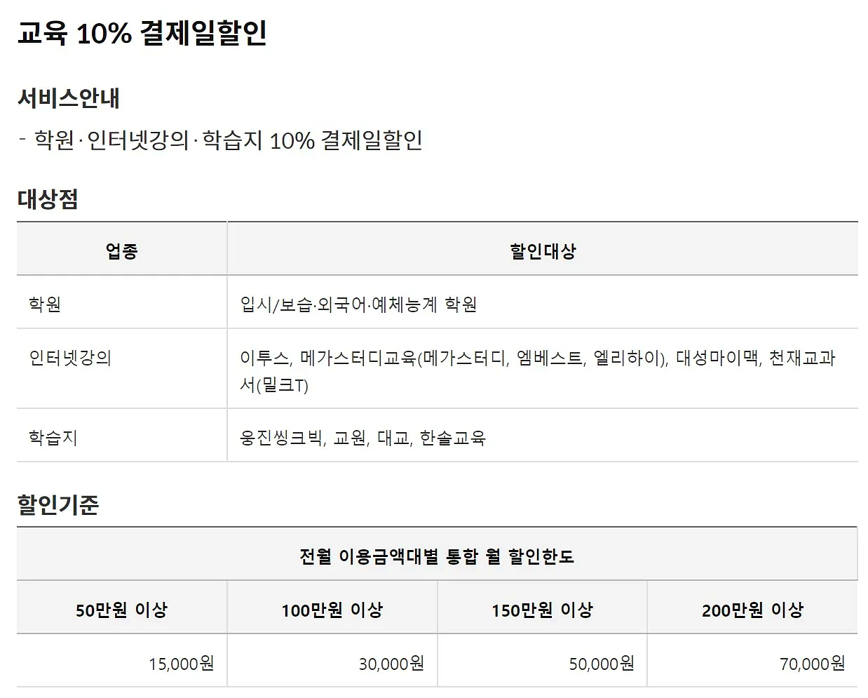 참고로, 이 카드는 연회비가 3만 원이며, 전월 실적 50만 원 이상을 충족해야 합니다. 학원, 인터넷 강의, 학습지 결제 시 10% 결제일 할인 혜택을 제공합니다. 또한, 아파트 관리비, 온라인 쇼핑 멤버십 정기결제, 배달앱, 해외 가맹점 및 해외 직접 구매 시에도 결제일 할인 혜택이 적용됩니다.