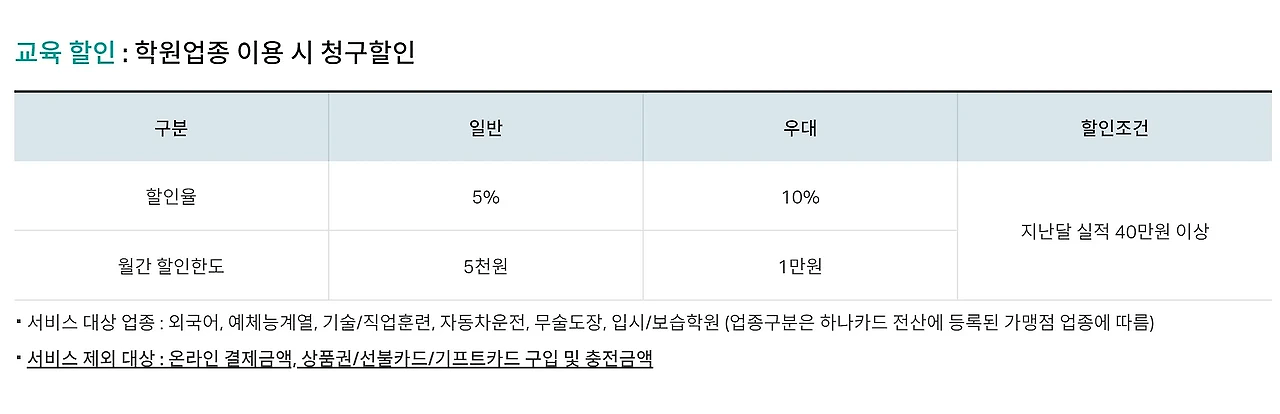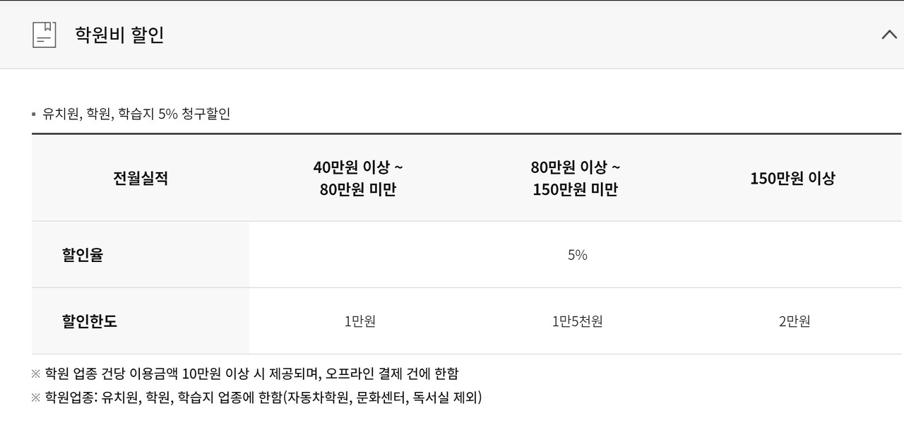 이 카드는 전월 실적 40만 원 이상일 때 학원비 5% 할인 혜택을 제공합니다. 이 혜택은 유치원, 학원, 학습지에서 오프라인 결제 시 적용되며, 건당 결제 금액이 10만 원 이상이어야 할인이 적용됩니다. 전월 실적에 따라 할인 한도가 달라지며, 최대 2만 원까지 할인을 받을 수 있습니다.