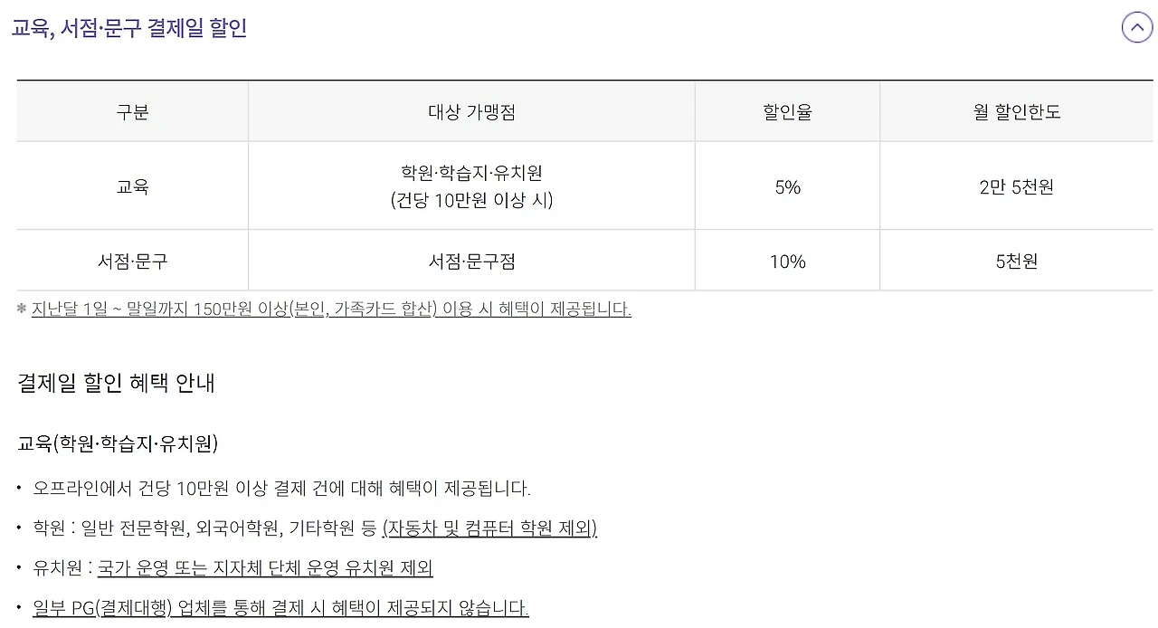 이 카드는 연회비 2만 원에 전월 실적 150만 원 이상이 요구됩니다. 학원, 학습지, 유치원에서 건당 10만 원 이상 결제 시 5% 할인 혜택을 받을 수 있으며, 서점과 문구점에서는 10% 할인 혜택을 제공합니다.