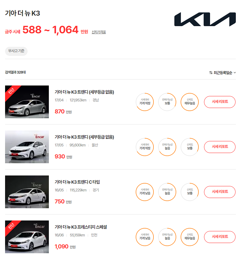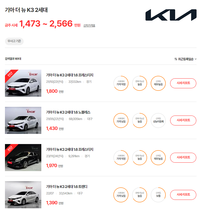 현재 K3 중고차는 엔카에 약 2200여 대가 등록되어 있습니다. 다음은 자세한 시세 정보를 확인해 보겠습니다.